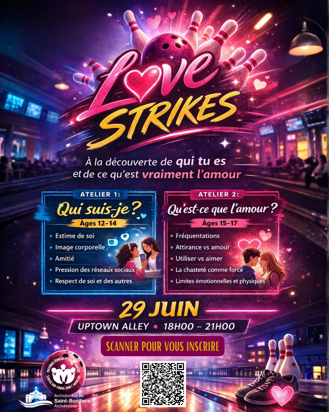 Envie d’une soirée à la fois sympa et enrichissante ? Rejoins-nous pour « Love Strikes ! » le 29 juin de 18 h à 21 h à l’Uptown Alley ! Cette soirée passionnante est ouverte aux jeunes de 12 à 17 ans et proposera du bowling, des pizzas, des boissons gazeuses et de vraies discussions sur la vie, l’identité et l’amour.