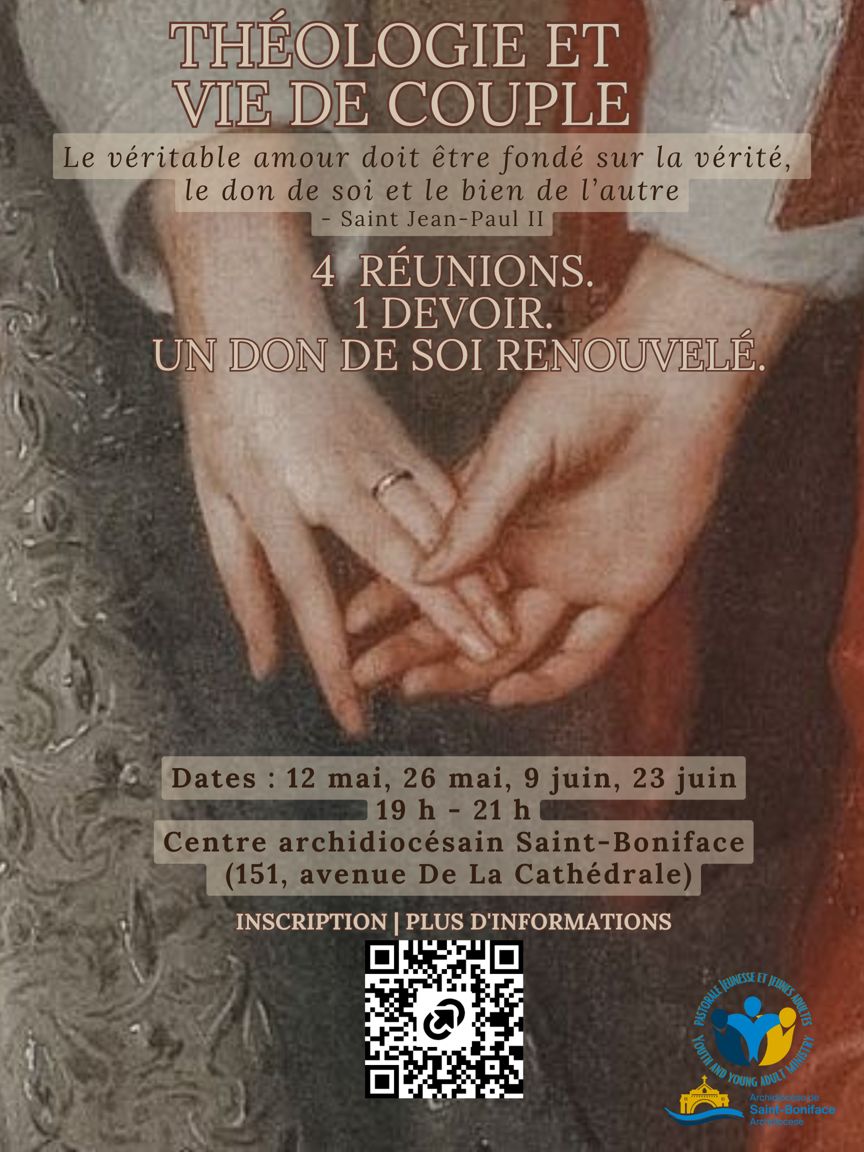 Vous vous demandez comment aborder les rencontres amoureuses catholiques avec un but et une intention précis ? L’archidiocèse de Saint-Boniface, par l’intermédiaire des services Jeunesse et Jeunes adultes et Mariage, famille et vie, présente cette série dynamique de quatre semaines destinée aux jeunes adultes, conçue pour vous interpeller et vous inspirer à aborder les rencontres avec détermination, courage et authenticité, afin de vous aider à devenir un véritable don de soi.