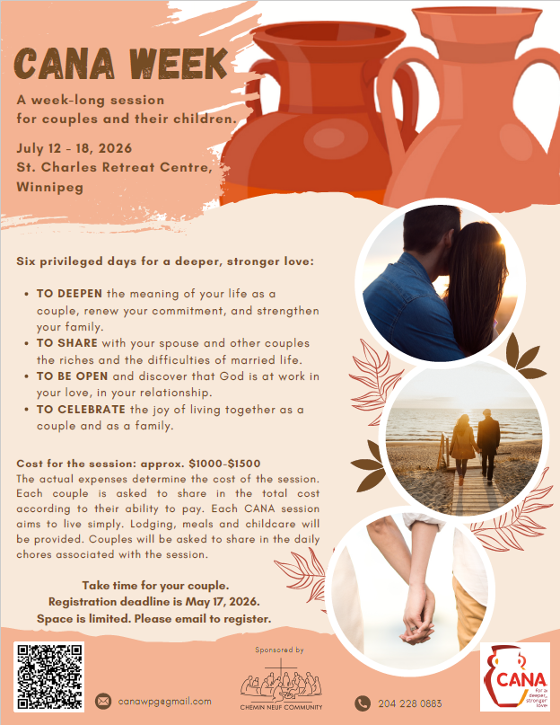Have you started making your plans for the summer? Are you able to set aside a week in July to deepen the meaning of your life as a married couple, renew your commitment, and strengthen your family? CANA Week is a six-day retreat for couples and their families, held this summer July 12-18, 2026 at the St. Charles Retreat Centre in Winnipeg. It provides a break from normal routine to let God “change the water of our daily lives into the wine of a wedding feast.”