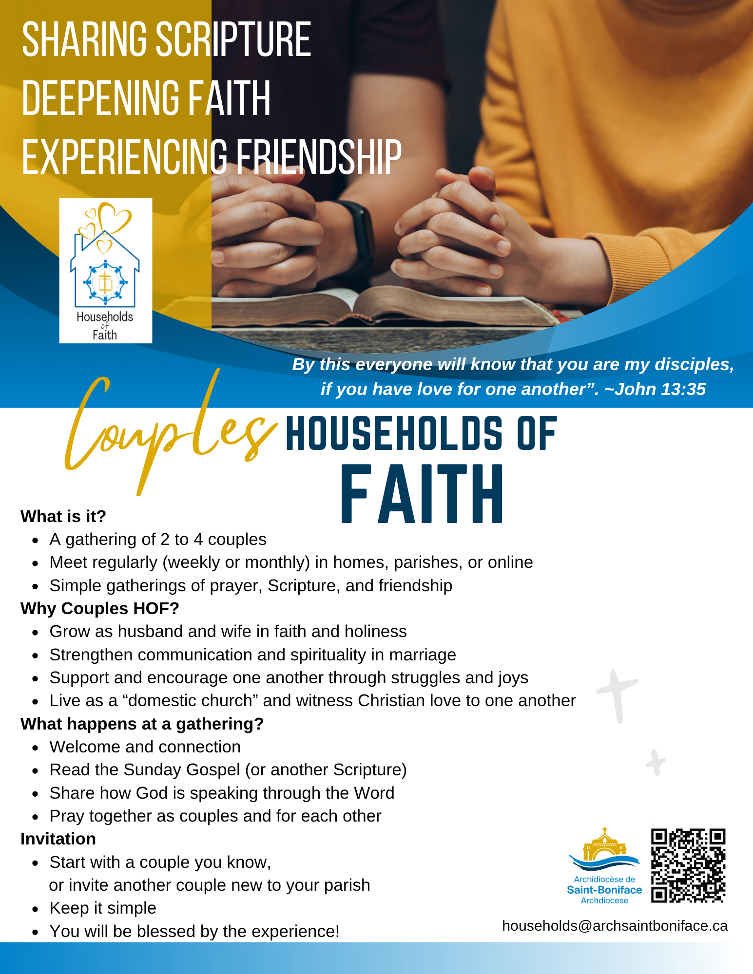 To begin a Couples Household of Faith, to get more information, or to join a group today, contact: households@archsaintboniface.ca or (204) 594-0273.